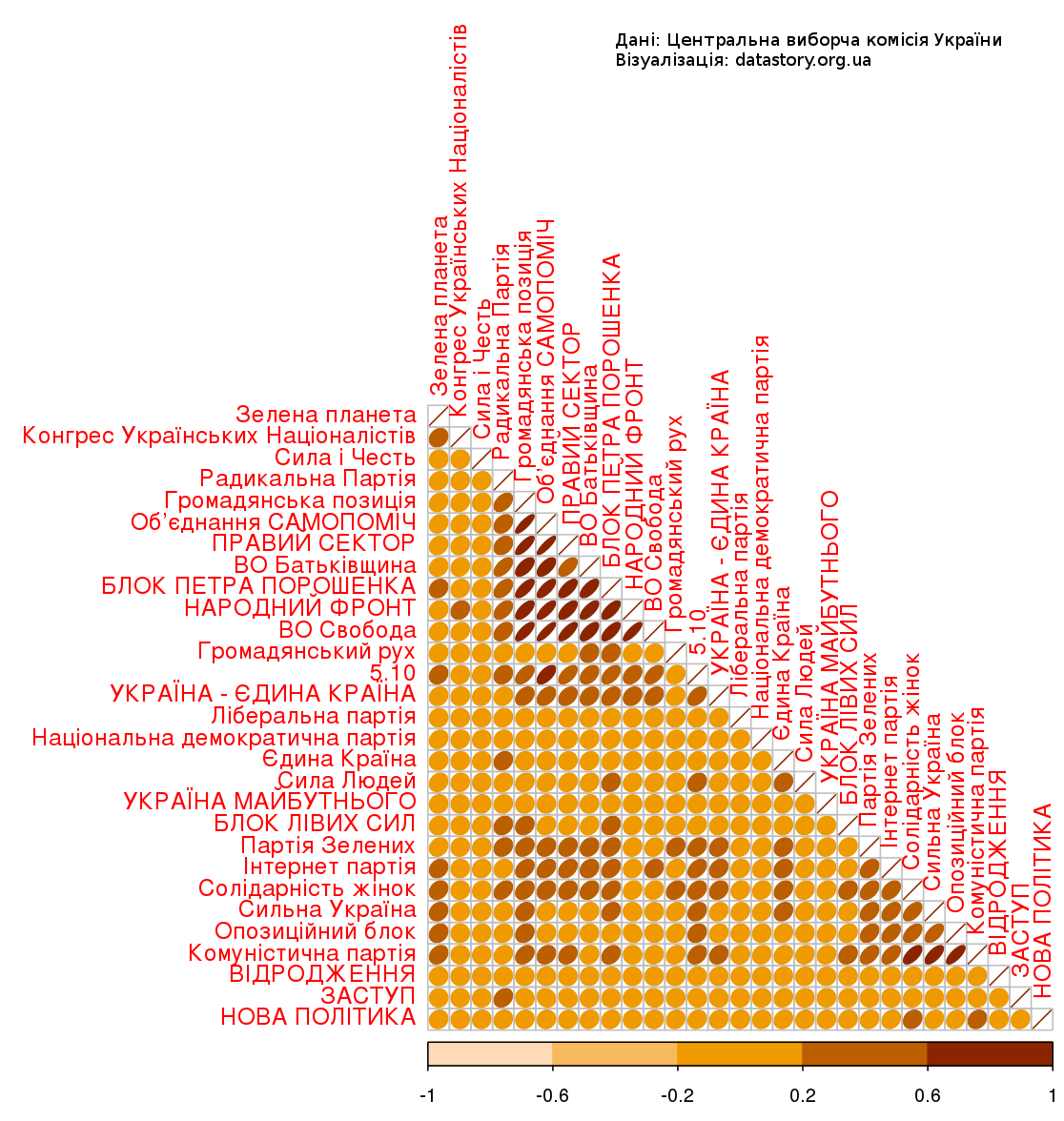 Для побудови корелограми я використав ієрархічну кластеризацію, щоб можна було побачити группування партійних груп. Колір та стисненість еліпсів на графіку вказує на силу кореляційного зв’язку.